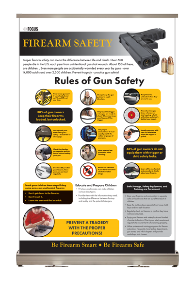 Visually striking and easy to set up, this display is perfect for school workshops, community gatherings, or safety awareness events. It covers topics ranging from safe handling practices to securing firearms in households. Our goal is to provide you with a tool that not only educates but initiates open conversations about firearm safety.