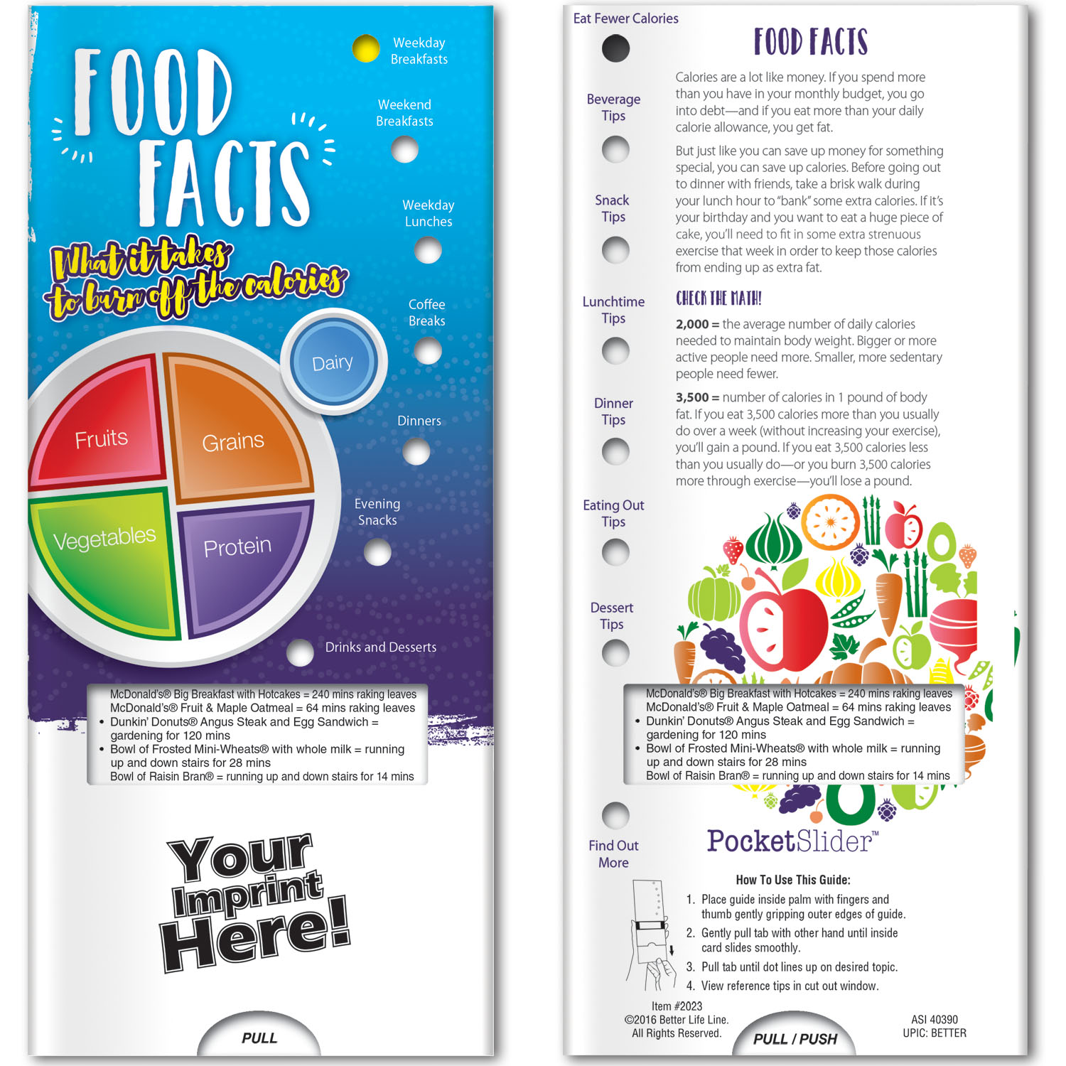 Sized perfectly for mailing in a #10 envelope. Printed on high quality card stock and gloss coating, with full color graphics, these two sided slide food facts guides are both durable and fun to use. On the front of the slider is where you have the option of adding your custom message and/or logo. Customizing your slider is a great way to increase awareness and gain exposure for your department or organization. The imprint area is large enough to display your logo and text for all to see, increasing your organizations visibility and further supporting your health education and nutrition program. What’s more, this slide chart is environmentally friendly, printed on recycled paper and made in the USA!