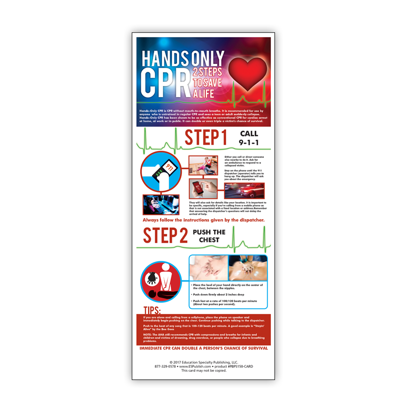 Provide your audience with two simple steps on how to save a life with this pocket sized Hands Only CPR information card! Each card is an exact replica of the “Hands Only CPR” displays. Making it an easy companion piece to hand out after a presentation.