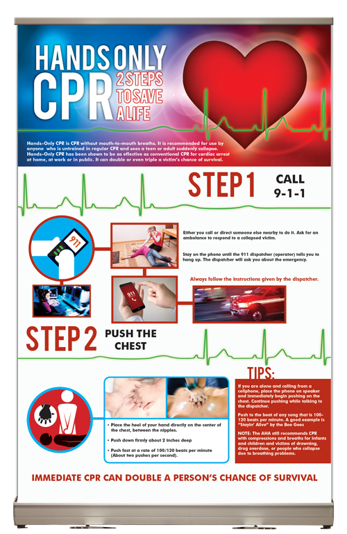 The “Hands Only CPR” Tabletop Display is a great way to explain the simple, yet effective way, to use two steps to save a life during an emergency.