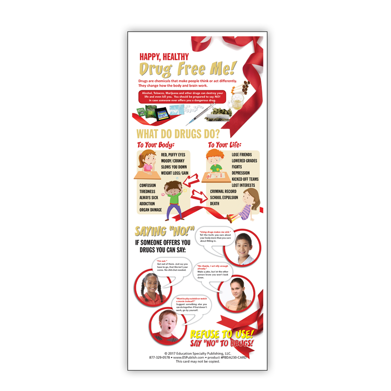 What’s more, these cards are a smaller, pocket-sized version of our matching “Healthy, Happy, Drug-Free Me” Displays. Each card includes the same detailed information and vivid graphics, but in a smaller portable size. Together with the display, the cards are an easy companion piece to hand out after your presentation. Hand them out during school assemblies, community events, or classroom discussions to leave a lasting impression on young audiences. The compact size makes them easy to distribute, and the eye-catching design ensures they’ll be read and shared.