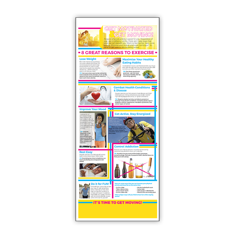 Spark a passion for health and fitness with our “Get Motivated and Get Moving” Presentation Cards. An energizing awareness tool to promote well-being. These cards are a comprehensive guide to a healthier lifestyle, covering everything from eight great reasons to exercise to mindful nutrition. Visually engaging and user-friendly, it transforms fitness concepts into actionable steps that resonate with individuals of all ages. Whether you’re a seasoned fitness enthusiast or just starting your wellness journey, this handout caters to all levels of experience.