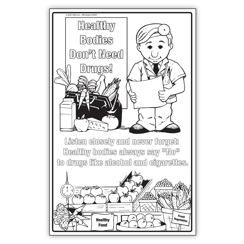 Teach children to say no to drugs with this bold and fun “Healthy Bodies Don’t Need Drugs” Color Me Poster! Kids will learn that better health comes from nutrition and exercise, not drugs. A great activity while learning the importance about making smart choices and staying away from drugs. When the kids are done coloring, hang them up in on the wall or fridge. Every time they see it, it reminds them to eat healthy. You can also hang them up in auditoriums, gymnasiums, cafeterias, classrooms and hallways and every time they see it, it’s another reminder to say no to drugs. Give kids an early start towards better health through nutrition and exercise.