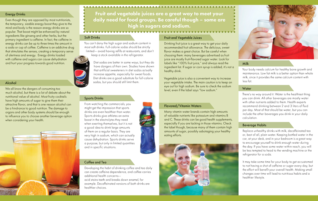 Raise your glass to wholesome living with this “Healthy Beverages” Pamphlet. While there used to be only a limited number of beverage choices available, the beverage market has exploded to include hundreds, maybe thousands, of choices. The problem with beverages that aren’t water is that they may contain lots of sugar and be high in calories. So, while it may not seem like a big deal to have several beverages in the course of a day, the calories do add up. This pamphlet discusses energy drinks, alcoholic drinks, soft drinks, sports drinks, fruit juices and more. Sip your way to a healthier you today!