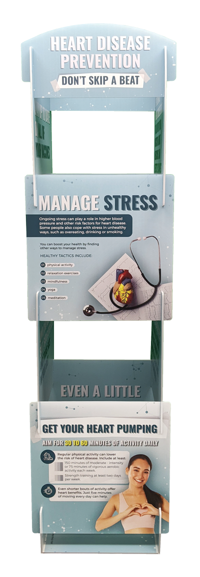 Brace yourselves for a heart-pumping solution that’s as informative as it is impactful with our Heart Disease Prevention: Don’t Skip A Beat Info Tower Display. This unique and innovative tower is a powerful tool for educators to raise awareness about heart health in your community.