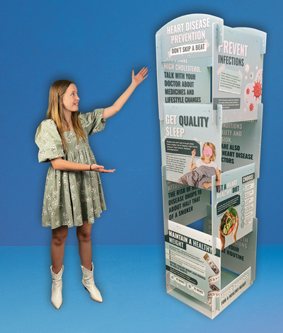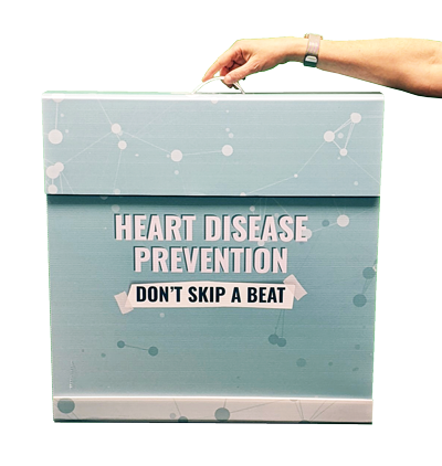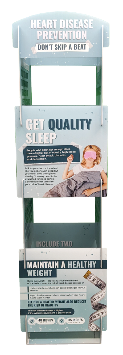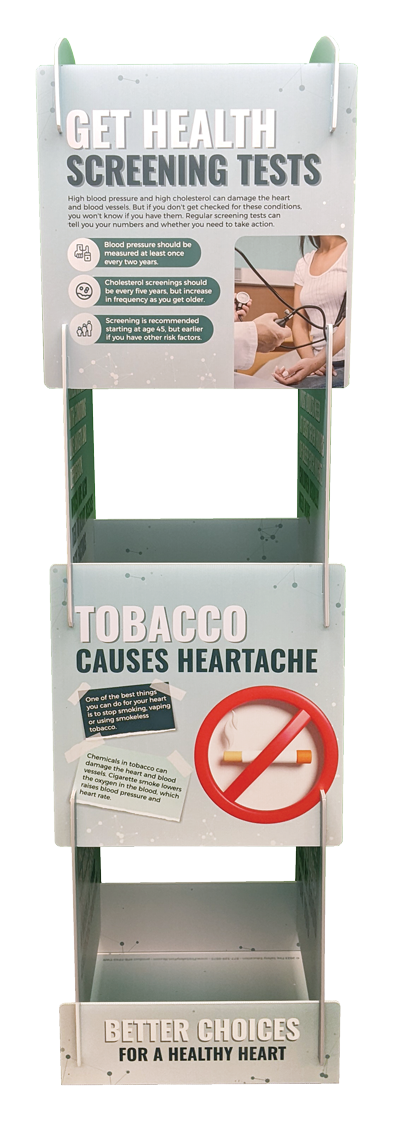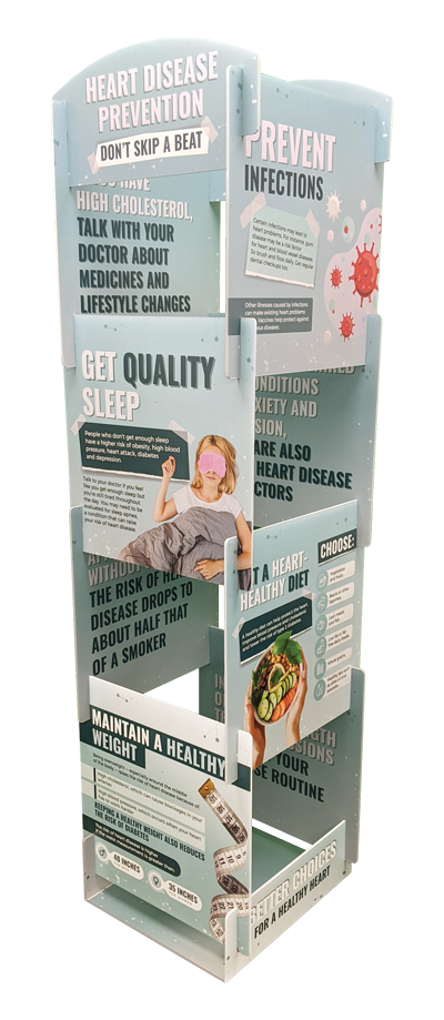 The versatile 4-sided 360-degree viewing angle design ensures that the information is visible from all angles. With 8 interlocking panels, this tower allows for a wide range of information to be presented, such as: nutrition tips, maintaining a healthy weight, managing stress, and more. Vibrant designs together with eye-catching, easy-to-read information make this tower a memorable and engaging resource for people of all ages and education levels. Whether it’s at seminars, community centers, or health fairs, this tower attracts attention and starts important conversations about heart disease prevention.