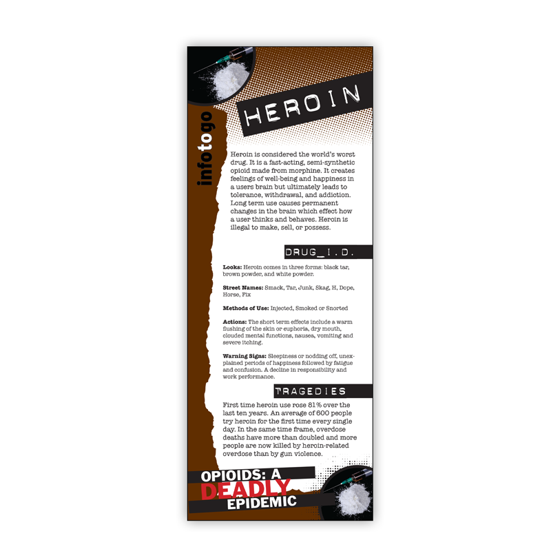 Educators that are interested in a convenient way to convey the dangers of Heroin will find this rack card a valuable, easy to use tool. It begins by noting what Heroin is, and how this highly addictive, deadly drug is causing widespread overdoses across the country. The United States is in the middle of a heroin and opioid epidemic. Heroin use between ages 18 – 25 years old has doubled in the last few years. Help educate your community about this dangerous drug!