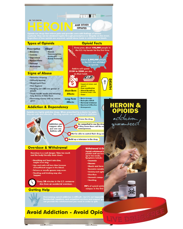 Get the facts about Opioid and Heroin addiction into and onto the hands of teens, students and adults with our all-in-one display, pamphlets, and wristbands package. Whether you’re hosting a health fair, a school event, or a community meeting, this package provides you with everything you need to inform, engage, and inspire action.