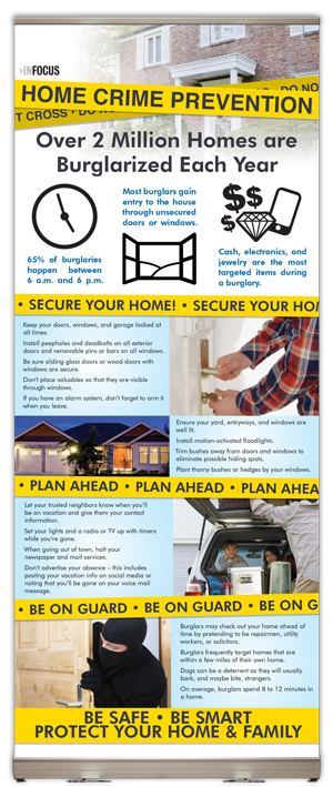 Step into a safer community with our Home Security and Crime Prevention Retractable Presentation Display. This comprehensive guide unfolds to reveal the secrets of fortifying homes against potential threats. Each display covers an array of essential topics, from practical tips on securing doors and windows to insights on planning ahead for vacations. Crafted with clear visuals and user-friendly content, it transforms complex concepts into actionable steps that is easy to understand.