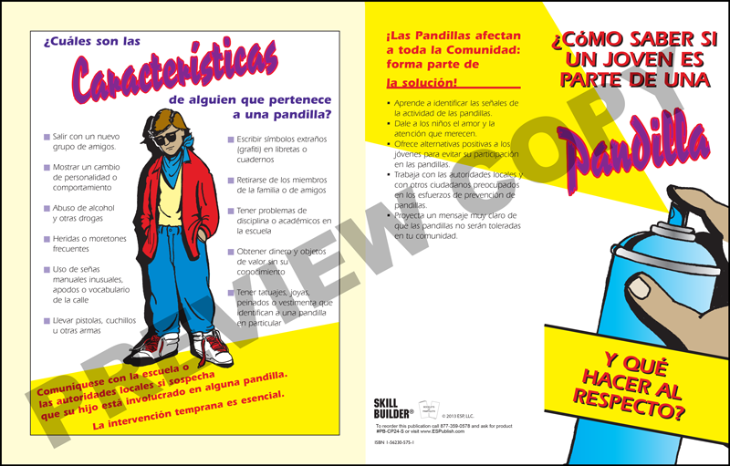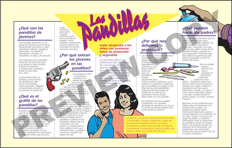 “How to Tell if a Kid is in a Gang” Spanish Pamphlet raises awareness about gangs and tells adults how to identify signs of gang involvement. The pamphlet answers common questions about gangs and recommends steps to take when gangs threaten the community. Additionally, it includes a definition of youth gangs, explains the reasons why young people join gangs, and tells parents what they can do to keep their children out of gangs.