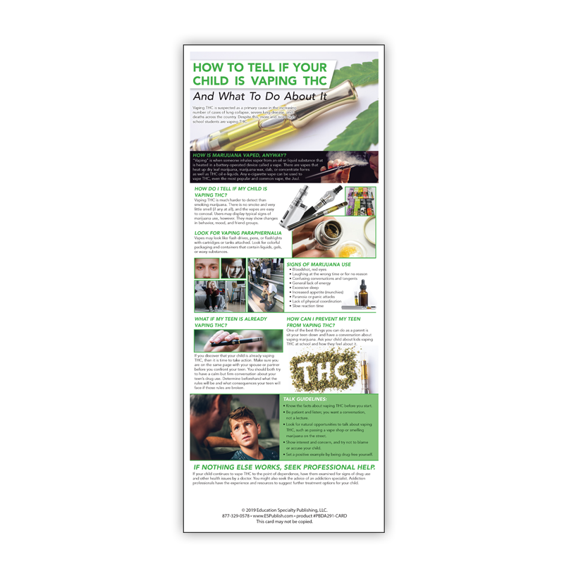 The “How to Tell If Your Child Is Vaping THC” Presentation Card is a great resource for parents and educators to tell if their teen is vaping THC. It also includes information about preventing their teen from vaping THC, and what to do if your teenager is already vaping THC. With engaging visuals, clear headings, and easily understandable information, these cards capture the readers’ attention and leave a lasting impression.