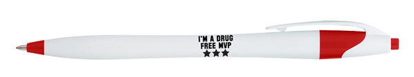 Promote a healthy, active lifestyle with these “I’m a Drug Free MVP” Pens. A great promotional giveaway for all types of events, and this affordable dart pen hits the drug prevention bullseye! Pens are a convenient way to make an impression and promote your organization, and this white pen with red accents along with a stand out drug prevention message is no exception! And even better, these handy giveaways are affordable – so you can give your audience a memorable gift without breaking the bank. Send a great message during Red Ribbon Week or hand them out as a classroom prizes. These useful, every day promotional pens are great for all ages as well as keeping the important message on going wherever they go. Use these promotional tools alone or together with our other “‘I’m a Drug-Free MVP” Materials.