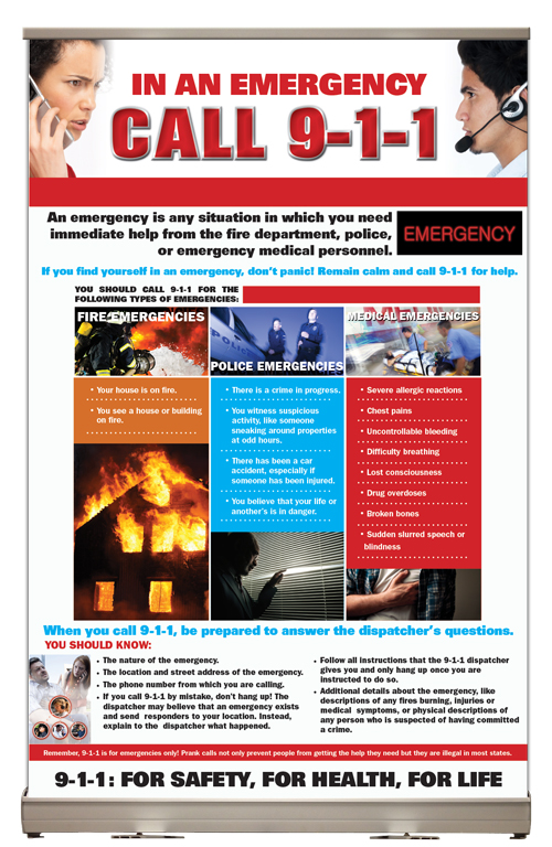 With this tabletop banner, your community will learn who to call for an emergency as well as when it is appropriate to call 9-1-1. 9-1-1 is a vital service that has been responsible for saving numerous lives. Emergencies are any situation in which an individual needs immediate help from the fire department, police, or emergency medical personnel. While it may be difficult, those finding themselves in an emergency need to remain calm and call 9-1-1 for help.