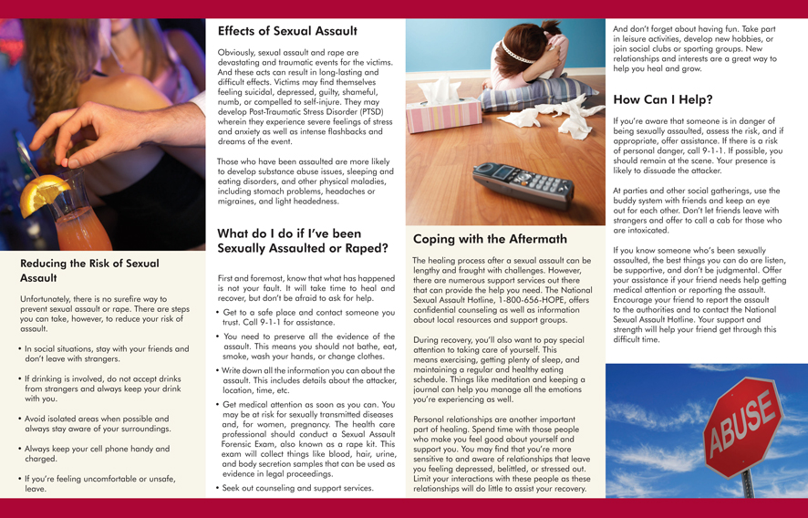 Bring awareness to sexual assault to your community with this informative pamphlet. Increasing awareness about sexual assault and rape is a key element in helping to prevent these acts from happening.