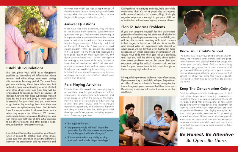 While no one has all the answers to these questions, this brochure exposes the reader to the difficulties and rewards of talking to his or her kids. It offers guidance, support, and resources to keep families talking. While also including actionable strategies to ensure that young children and their parents have meaningful conversations about substance abuse and focuses on building trust in the relationship.