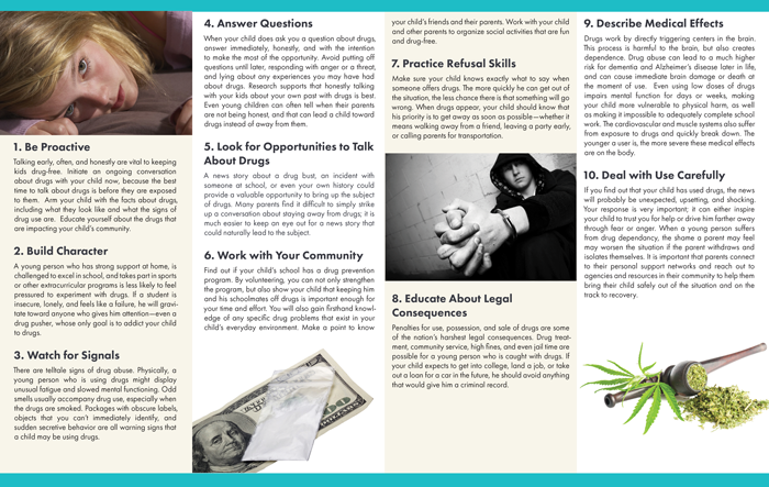 - Provides 10 actionable tips that parents can use to help prevent drug use