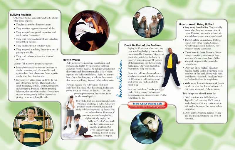 This pamphlet debunks the theory, held by many adults, that bullying is a normal. The brochure examines the long term harm that bullying causes in the lives of both victims and bullies. It corrects the most widespread myths about the practice and examines the characteristics of typical bullies and victims. It exposes the vicious character of bullying through an analysis of the bullying process. Readers are confronted with the fact that, even though most kids are uncomfortable with bullying, a majority tacitly condone or even encourage it. Also provided are suggestions on how to avoid becoming a victim of bullying. Plus what not to do in response to a bullying incident.