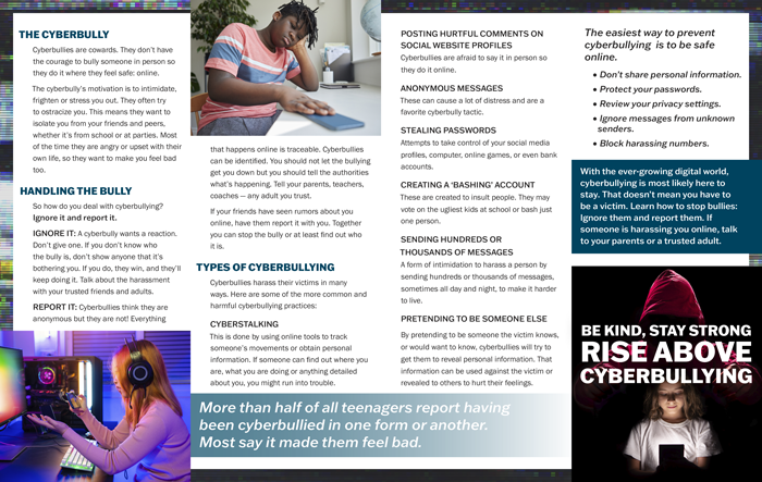 Specifically designed with kids and teens in mind, our pamphlets offer age-appropriate information on cyberbullying, including what it is, how to recognize it, and strategies for dealing with it effectively. We inspire kids to speak up, seek help, and take action against cyberbullying in their schools and communities.