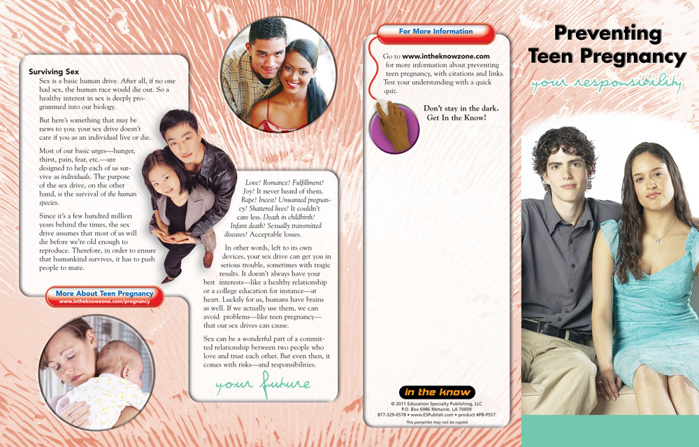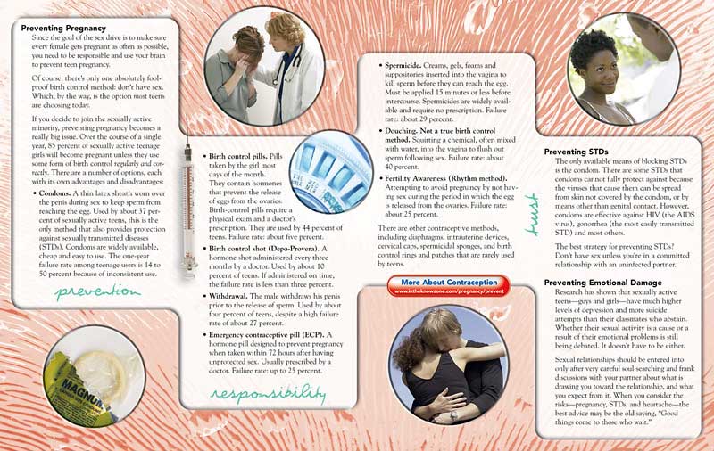 This pamphlet presents a sobering view of the sex drive as a force concerned only with the survival of the species and oblivious to the well being of the individual. Thus placing the responsibility for birth control and disease prevention entirely on teens who choose to become sexually active. It also discusses common forms of contraception and their failure rates. Readers are directed to the “In the Know Zone” website for in-depth information on the subject.
