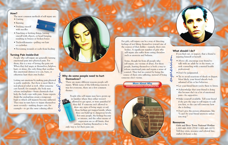 The pamphlet explains the reasons people self-injure and provides extensive suggestions for approaching a friend or family member you suspect of self-injuring.