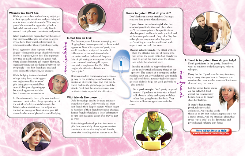 The pamphlet examines the growing ease with which relational aggressors can broadcast their venom through the Internet, Instant Messaging, e-mail and blogging. Along with the possibility that the electronic paper trail created by these media may provide a means of tracking down aggressors. The pamphlet offers sound advice on how to respond effectively to social aggression. Also, how to help a friend who is being victimized.