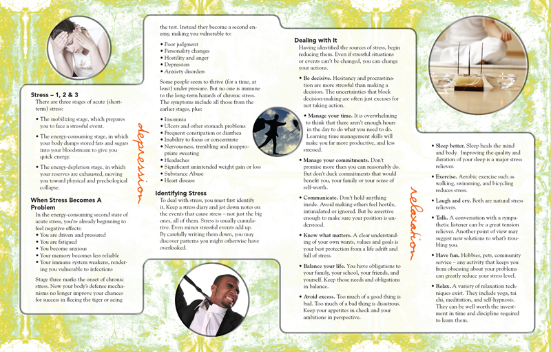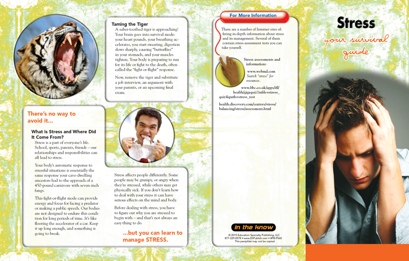 Stress is a killer. Stress in young people can lead to health and emotional problems. The “In The Know: Stress- Your Survival Guide” Pamphlet exposes the harmful effects of stress on a young person’s mind and body. It also provides helpful suggestions and solutions for managing stress and its negative effects.