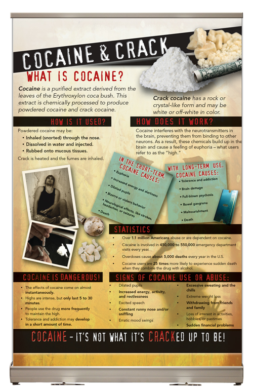 The display begins by noting that cocaine is a purified extract from the coca plant. Its chemically processed to produce both powdered cocaine and crack. Crack cocaine, on the other hand, has a crystal or rock like form.