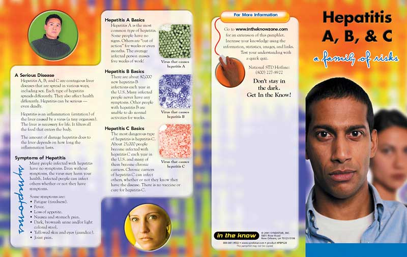 This pamphlet explains that hepatitis is a general term for liver inflammation, and that sexual contact is one common infection source. There are three strains of virus — Types A, B, and C — and that they differ in severity and treatment ability. Hepatitis A is preventable through vaccination and is curable, with only a brief period of communicability. Hepatitis B vaccines can prevent that strain, but it is not curable. Moreover, the carrier of the virus may remain a potential source of infection for life. It can cause cirrhosis of the liver and liver cancer in those with the chronic form.