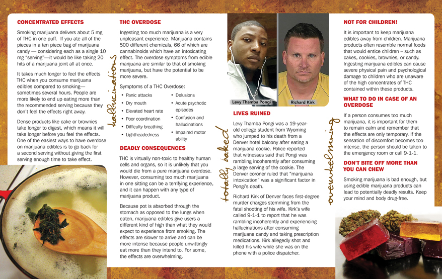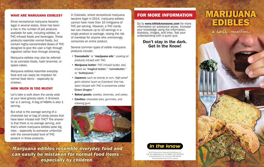 These In the Know: Marijuana Edibles – A Harsh Mellow pamphlets gives a complete overview of the risks of consuming THC. The brochure outlines the dangers faced by edible marijuana users, as well as the signs of a THC overdose.