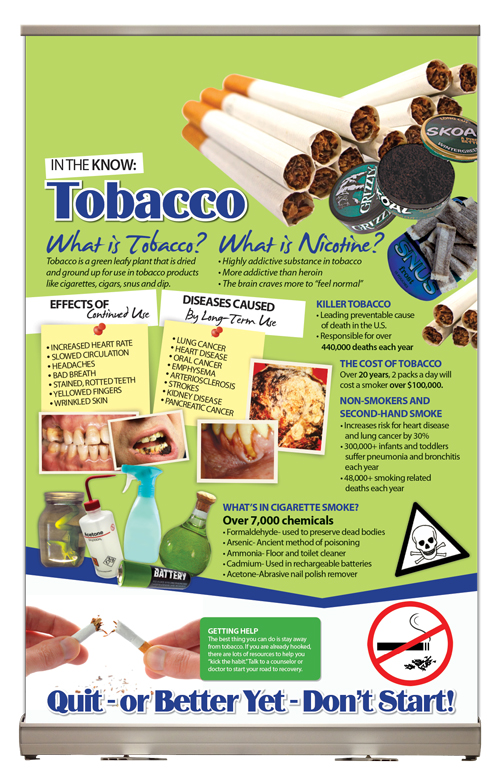 With this retractable tabletop banner, you’ll be able to provide your audience with a straightforward and thorough overview of tobacco in all of its forms. Tobacco use is the leading preventable cause of death in the United States. The display begins by noting that tobacco is dried and ground up for use in products like cigarettes, snus, chew, and cigars. These products contain nicotine, which is incredibly addictive. It has been reported to be more addictive than heroin.