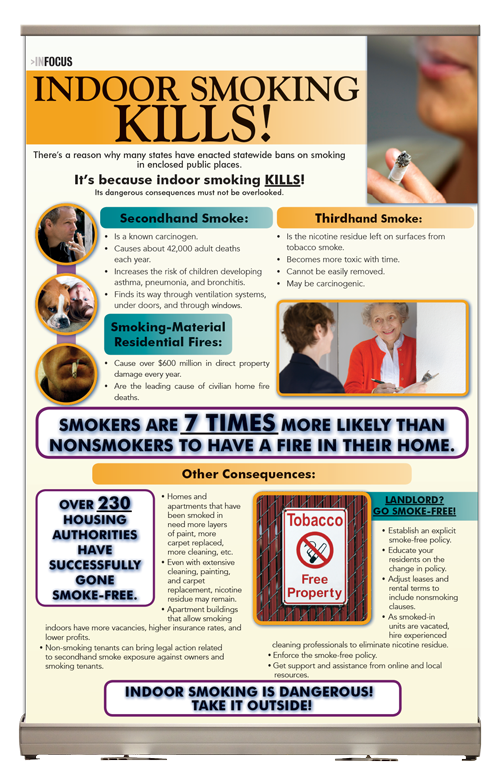 This comprehensive Indoor Smoking Tabletop Banner addresses an issue that’s of concern to a wide variety of audiences. Whether you’re speaking to property managers, landlords, or residents, you’ll find that this display is full of useful information that’s presented in a clear and straightforward manner.