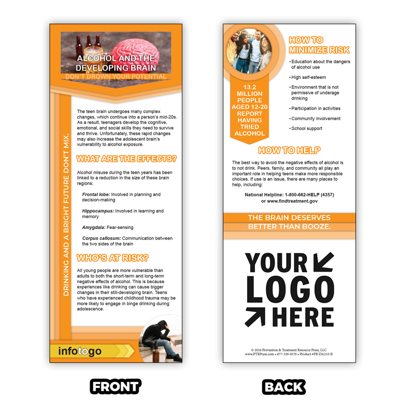 Discover the impact of alcohol on young brains with our info-to-go rack cards. Our rack cards offer concise, easy-to-understand information that highlights the dangers of alcohol consumption on the developing brain. Perfect for community events, school programs, and awareness campaigns, these rack cards are specifically designed to captivate and educate.