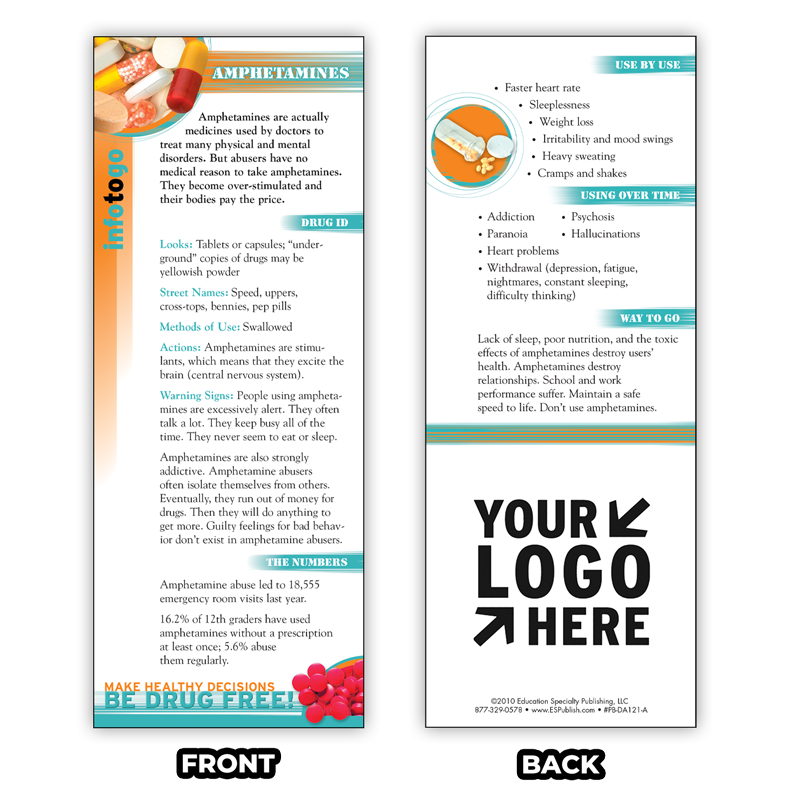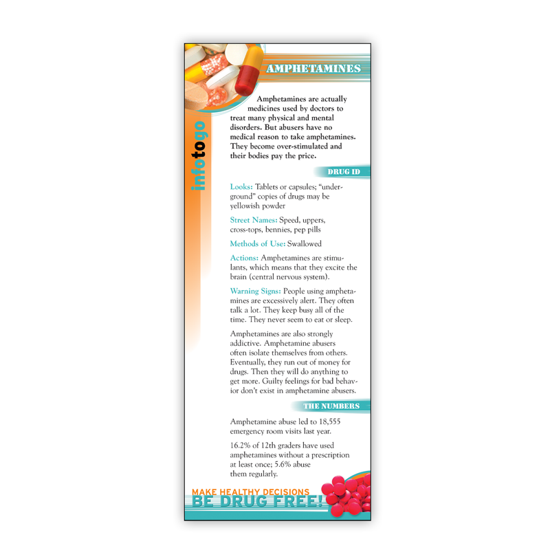This useful, two sided Amphetamines Rack Card provides concise information on these strongly addictive prescription drug stimulants. Prescription stimulants like Adderall and Dexedrine, along with illicit amphetamines like methamphetamine and ecstasy, are highly addictive. Kids are pocketing these “pep pills” and selling them to friends or handing them out at parties. The card describes amphetamines effect on the brain as well as the dangerous physical and psychological effects of abuse. In conclusion, is a “Way to Go” anti-use call to action. Use it a great stand alone handout or use it together with our other rack cards. In short, make healthy decisions – Be Drug Free!