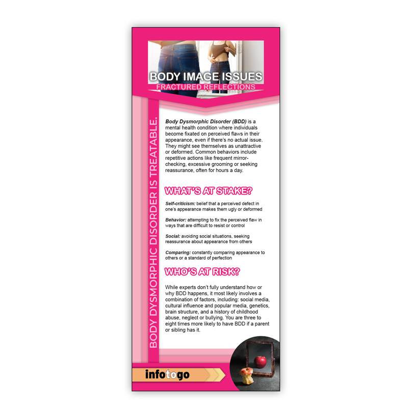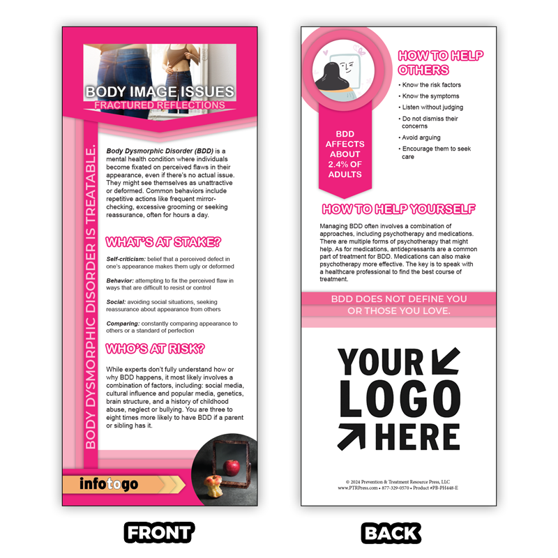 Spark conversations and provide vital insights into body dysmorphic disorder (BDD) with our Body Image Issues Rack Cards. Packed with essential information, they deliver clear insights into understanding the challenges individuals face, who’s at risk, as well as how to extend support to others and yourself.