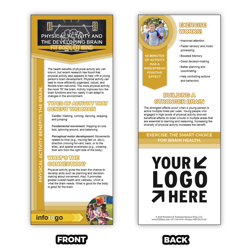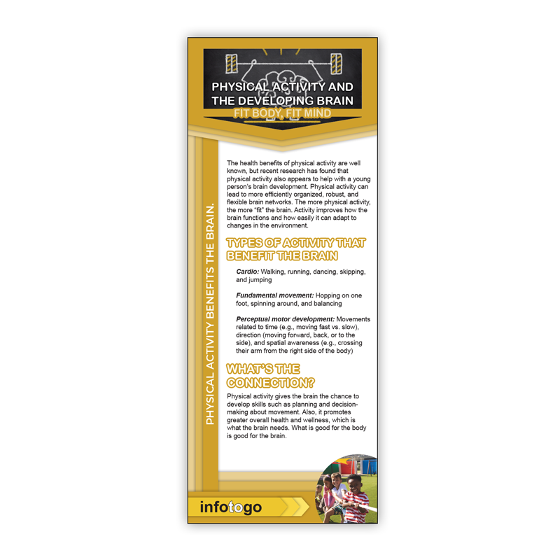 Enhance kids’ brain health with our Physical Activity and the Developing Brain Rack Cards. These cards are the perfect tools to distribute at events, spreading awareness about the link between physical activity and brain development in children. By promoting exercise, these cards help foster better brain development, supporting children’s academic performance and overall well-being.