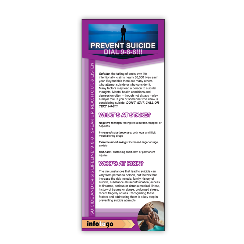 Spark conversations, create awareness and save lives with our Suicide Prevention Rack Cards. Packed with essential insights on recognizing signs, initiating conversations, and accessing professional help, these cards are your go-to resource for helping those around you. Busy schedule? No problem! Slip them into your bag, display them in the classroom, or distribute them at events. These compact cards ensure you’re equipped to make a difference wherever you go.