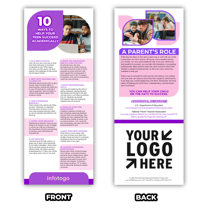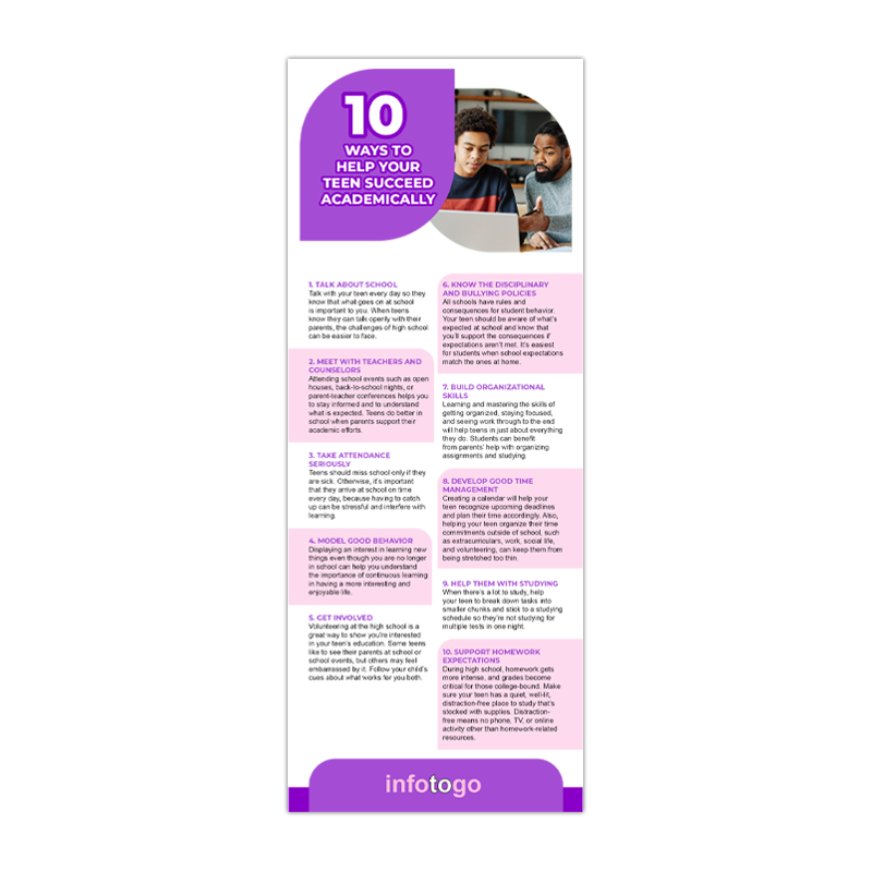 Equip parents with the knowledge to help their teens reach new academic heights with “10 Ways to Help Your Teen Succeed Academically” Rack Cards, because success starts at home.