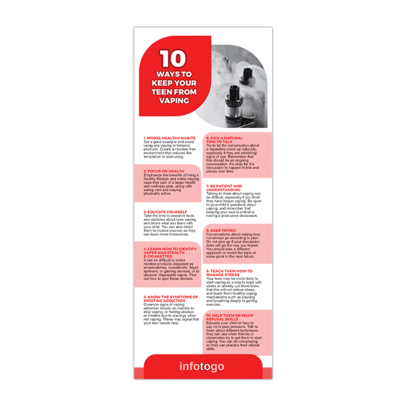 Vaping among teens is a growing concern, but the ‘10 Ways to Keep Teens From Vaping’ Rack Card offer parents and guardians a practical, easy-to-use guide to help their teens avoid the habit. These cards provide clear, actionable advice that helps parents to have open conversations, set boundaries, and offer healthier alternatives to vaping.