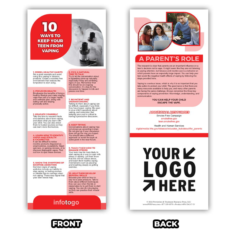 Equip parents with the right tools to help keep their teens on a healthy path. The ‘10 Ways to Keep Teens From Vaping’ Rack Cards offer straightforward advice that’s easy to apply in everyday life.