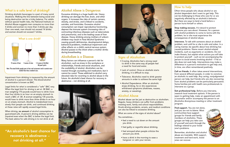 Most importantly, this pamphlet will empower the reader with a list of warning signs of alcoholism and alcohol abuse. The readers can then become proactive through reading and retaining the valuable information from the help section. Alcohol abuse and alcoholism are not only dangerous to the abuser, but also to the people around them. This handout is an important guide that could possibly save many lives.