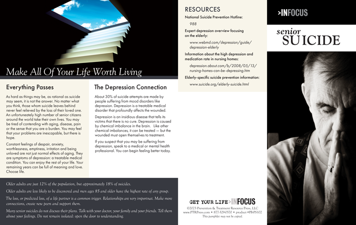 Foster awareness and understanding with these Senior Suicide Prevention Pamphlets. These pamphlets are designed for easy distribution, making it effortless to share valuable insights on recognizing warning signs, offering support, and fostering a community that prioritizes mental health for senior citizens.