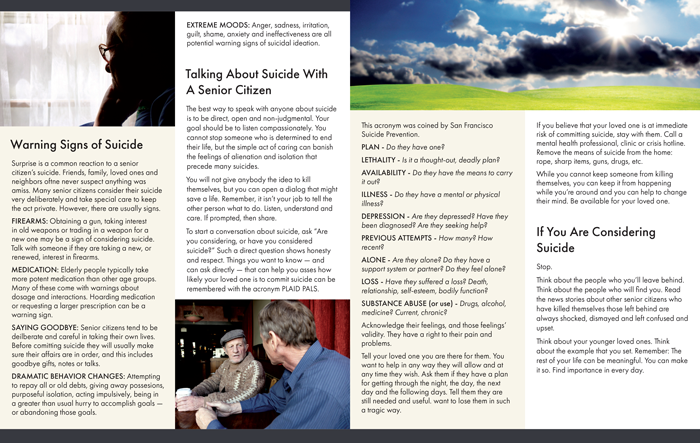 Each pamphlet covers essential topics, from understanding risk factors to encouraging open conversations about mental well-being in the senior community. Crafted with clarity and empathy, these pamphlets transform potentially delicate information into accessible and actionable steps.