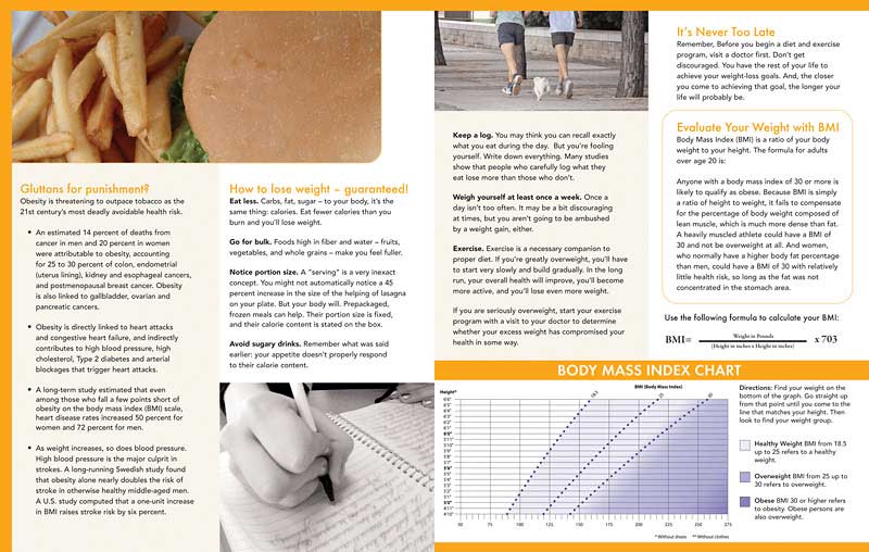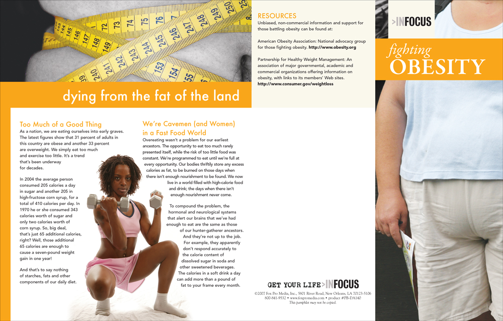 With this “InFocus” brochure, the reader will learn that obesity by itself a very hazardous risk to one’s well being. It is also a gateway to diseases and issues that can bring imminent death. These diseases and issues include heart attacks and congestive heart failure, colon, endometrial, kidney, gallbladder, ovarian, pancreatic, and esophageal cancers, and premenopausal breast cancer. There is also a detailed list of how to lose weight. It suggests for the participant to seek the advice of a doctor. And a Body Mass Index is provided and explained for the reader to become more active. People need education, support, and encouragement to dedicate themselves to living a healthier life. This “InFocus” pamphlet will enrich the participant with the knowledge, support, and encouragement he or she needs for a successful weight loss commitment.