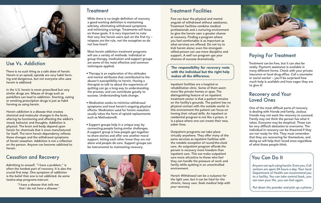 These pamphlets can be distributed in various settings, such as schools, community centers, healthcare facilities, and correctional institutions, reaching a diverse range of individuals. In conclusion, by providing education, resources, and hope, these pamphlets contribute significantly to the fight against heroin addiction. As a result, promoting a healthier and safer community for all.