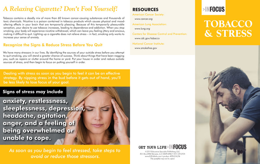 This In Focus tobacco and stress pamphlet informs the reader about the relationship between nicotine addiction and anxiety. This is one of the top reasons that smokers stumble along the way in their quest to live tobacco free. The pamphlet notes that tobacco contains a deadly mix of more than 60 known cancer causing substances and thousands of toxic chemicals.