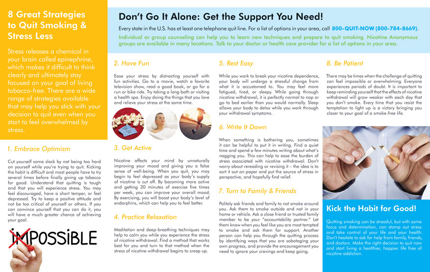This pamphlet offers eight different tips proven to help smokers reduce the stress of nicotine use and withdrawal. It also encourages readers to practice stress reduction methods, adopt an optimistic approach, get active, get rested, and embrace relaxation on their way to a healthier, tobacco free life.