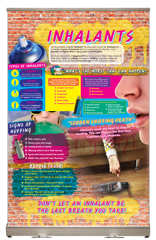 Our Inhalants Tabletop Banner warns audiences of all ages the dangers of huffing. That the sniffing or “huffing” of fumes from household products, aerosols, solvents, and other common chemicals is so potentially dangerous that users have died on their first experiment with it. Audiences will learn that the short and long term effects of inhalants range from possibly permanent loss of bladder and bowel control to irreversible brain and organ damage, blood disease, heart attacks and sudden death. The display also covers the signs that someone is abusing inhalants.