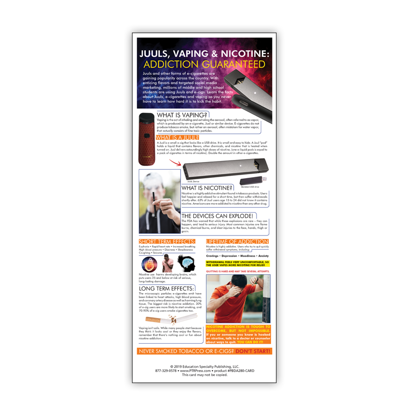• Pocket-sized version of the matching “Juuls, Vaping & Nicotine: Addiction Guaranteed” displays