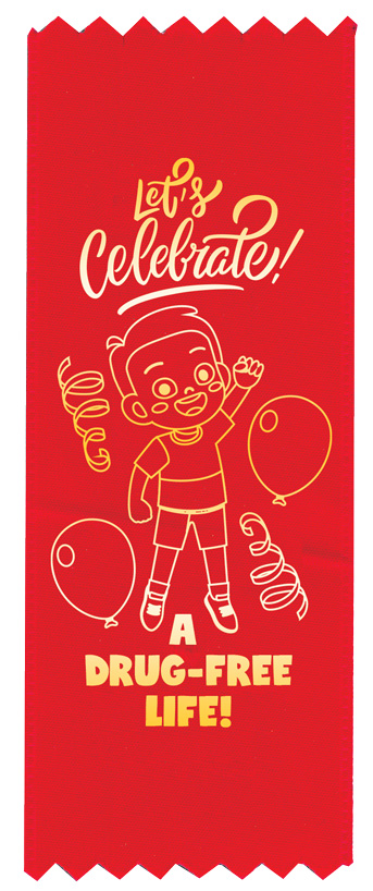Each “Let’s Celebrate! A Drug-Free Life!” red with a gold imprinted ribbon features: