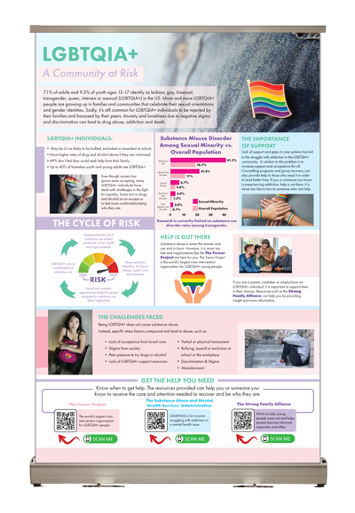 Illuminate the path to support and understanding with our LGBTQIA+ Awareness Tabletop Display. This engaging tabletop is your go-to resource for sparking meaningful conversations during LGBTQIA+ awareness events. The display explains the nuanced factors that can influence substance misuse within the LGBTQIA+ spectrum. It provides helpful information for at-risk teens and the LGBTQIA+ community, covering the dangers of substance misuse and abuse while also including information on finding support, safe spaces, and where to get help.